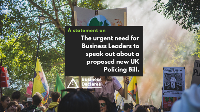 The Directors of Business Declares believe that protest is a vital part of democracy. We believe that clamping down on the right of people to speak out does not create a healthy, diverse and prosperous society; nor does it create the conditions in which businesses can grow and innovate.