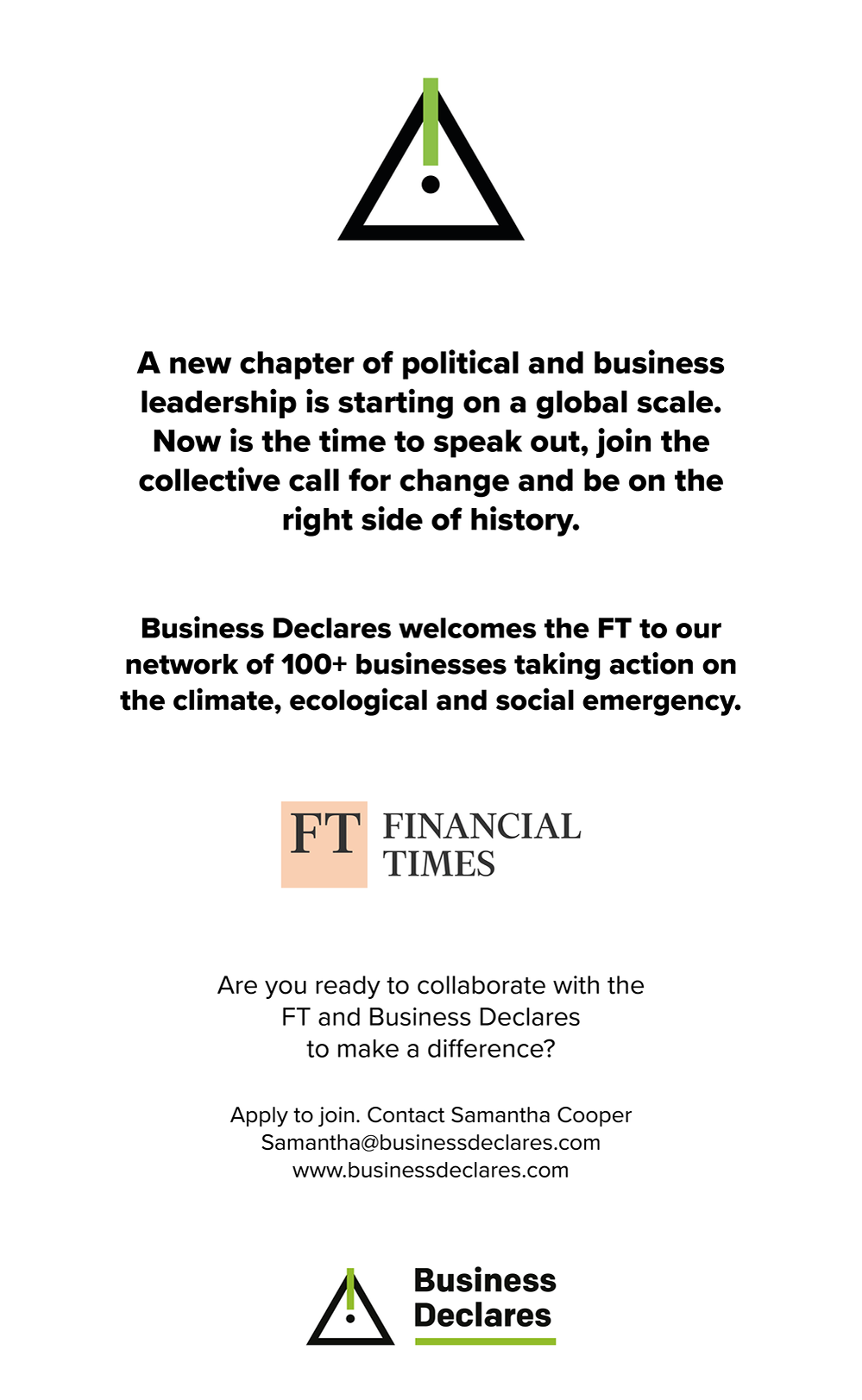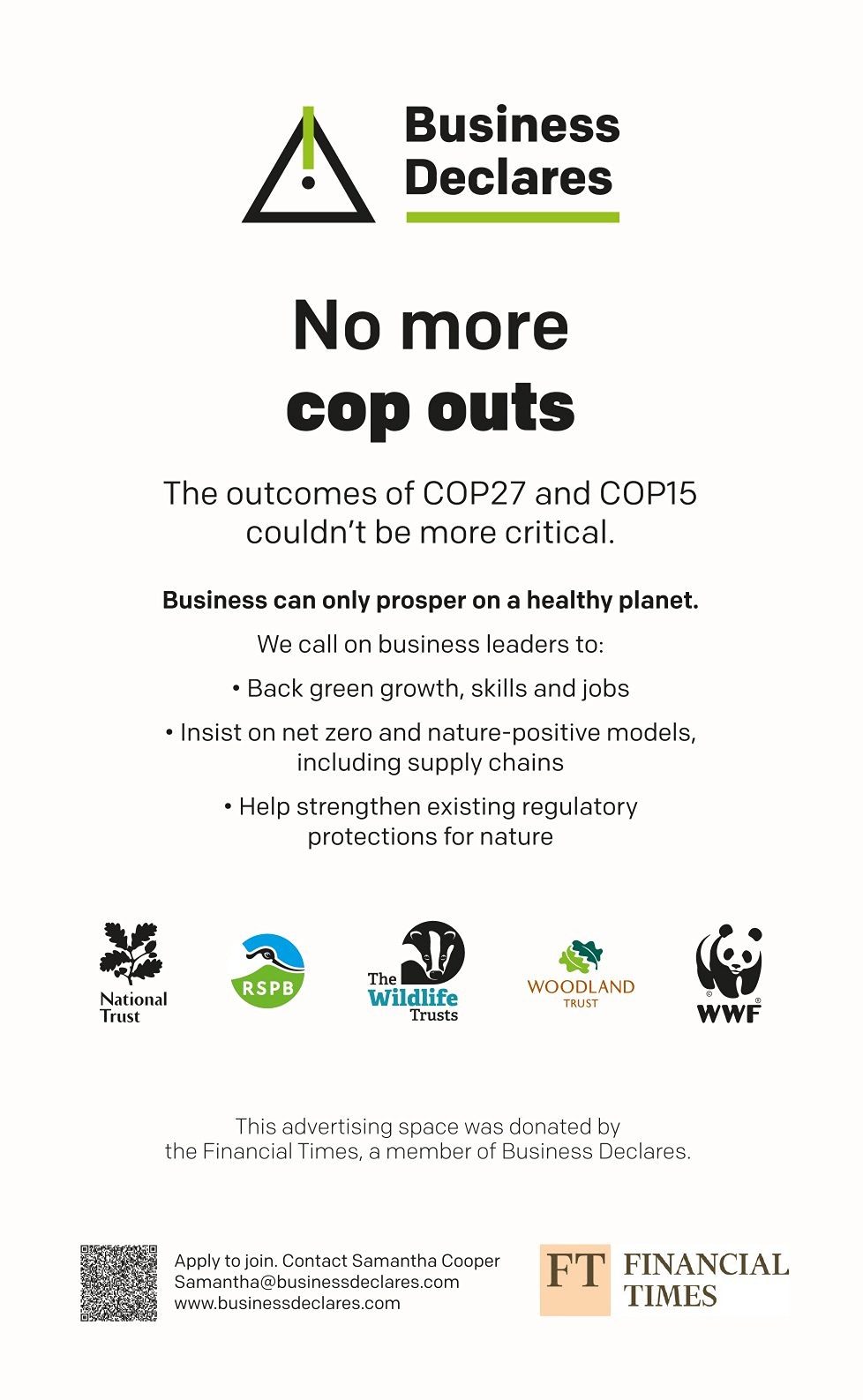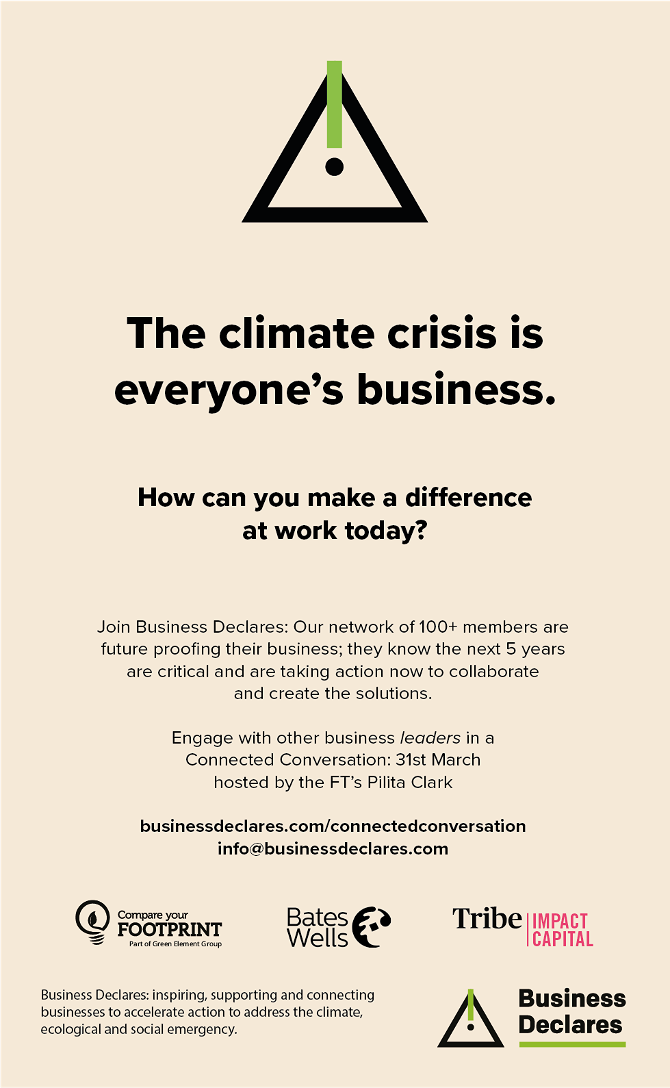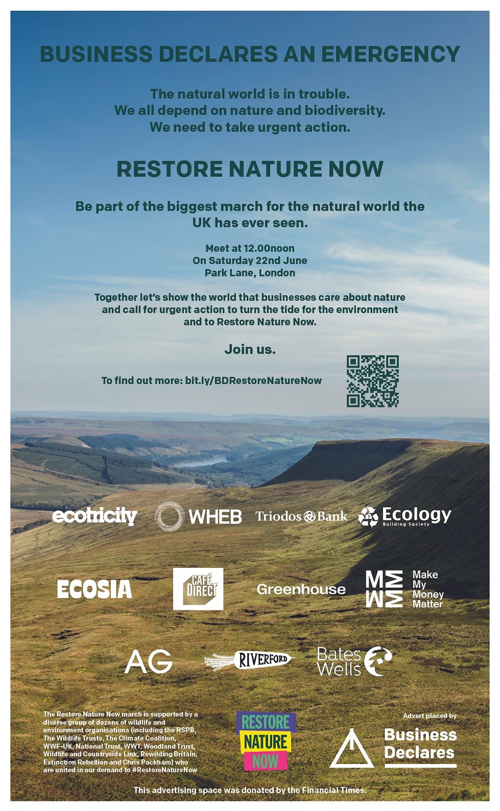 Since 2022, Business Declares has partnered with the Financial Times print edition, to amplify our urgent, collective call for leadership and advocacy regarding the climate, nature and social polycrisis - from our ‘Connected Conversations’ campaign around business leadership on the climate crisis, to calling on business professionals and people to queue for climate and nature, to ensure that communities, families and businesses can thrive with nature.