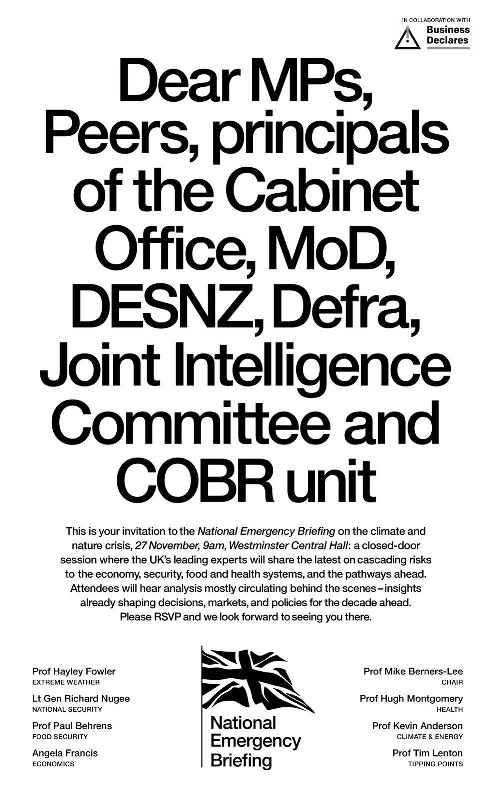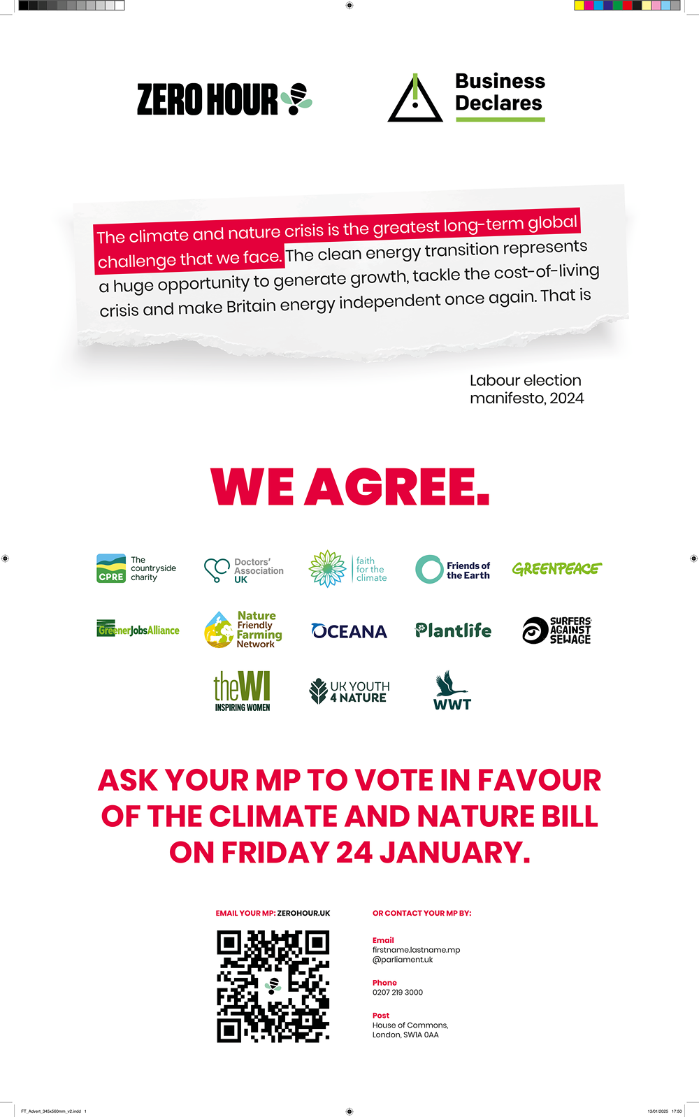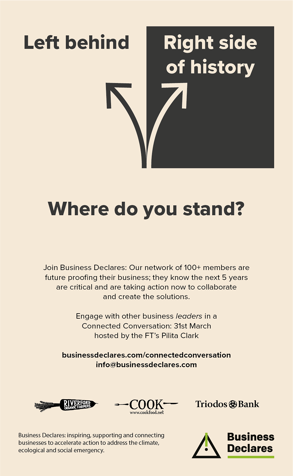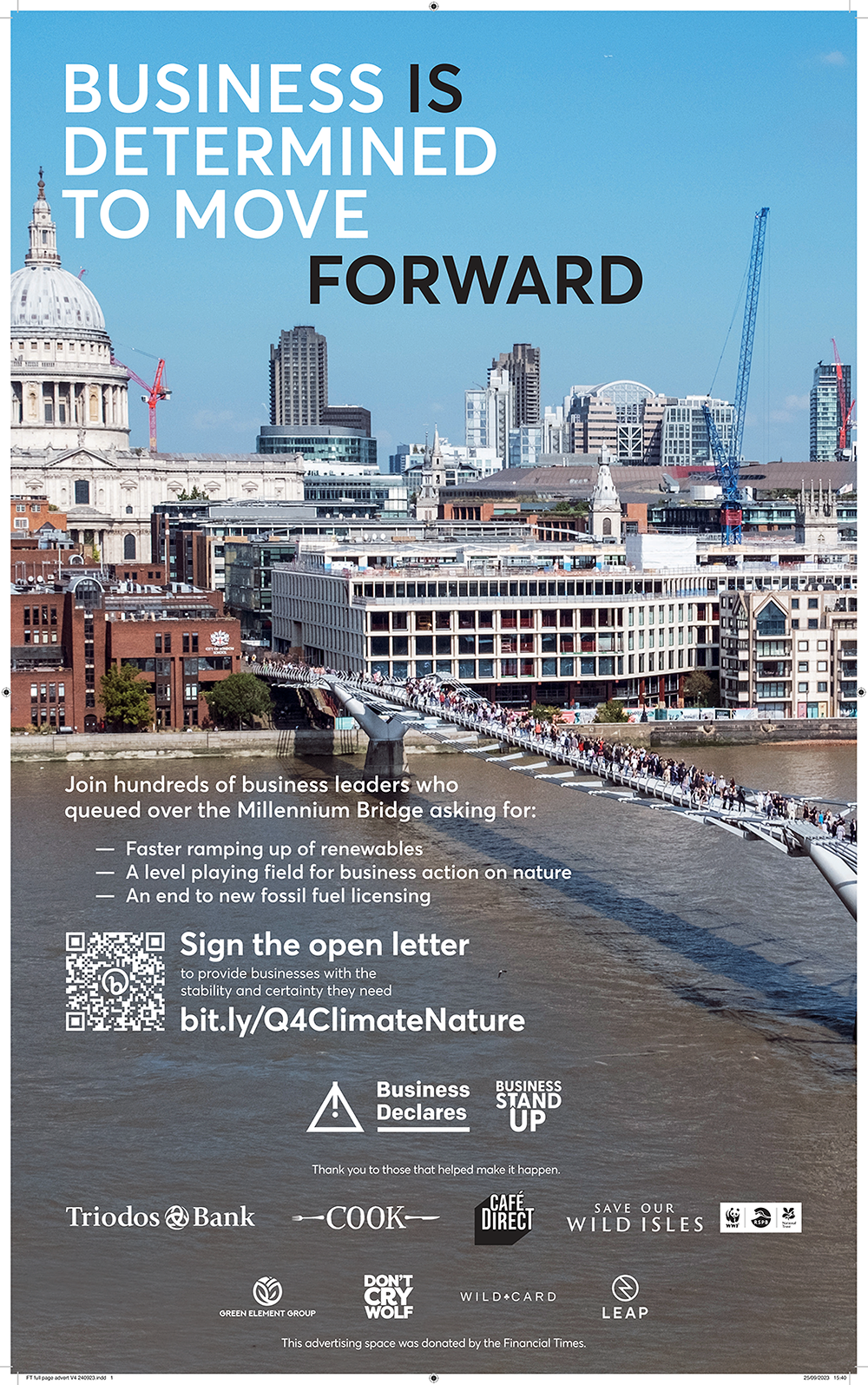 Since 2022, Business Declares has partnered with the Financial Times print edition, to amplify our urgent, collective call for leadership and advocacy regarding the climate, nature and social polycrisis - from our ‘Connected Conversations’ campaign around business leadership on the climate crisis, to calling on business professionals and people to queue for climate and nature, to ensure that communities, families and businesses can thrive with nature.